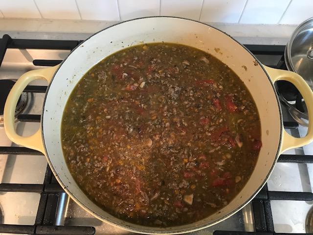 Once they’ve been in there for a while and released most of their water, but before full scale oppression takes place, throw the ground beef in and let it brown up for a while. Ground beef will keep the unruly vegetables in line, it’s like Switzerland with the power of a G-5 nation.
